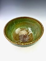 Salad bowl for 2-4 with carved design on inside foot allowing grating of garlic in one bowl salad prep. (5in. h x 8.5in. w)